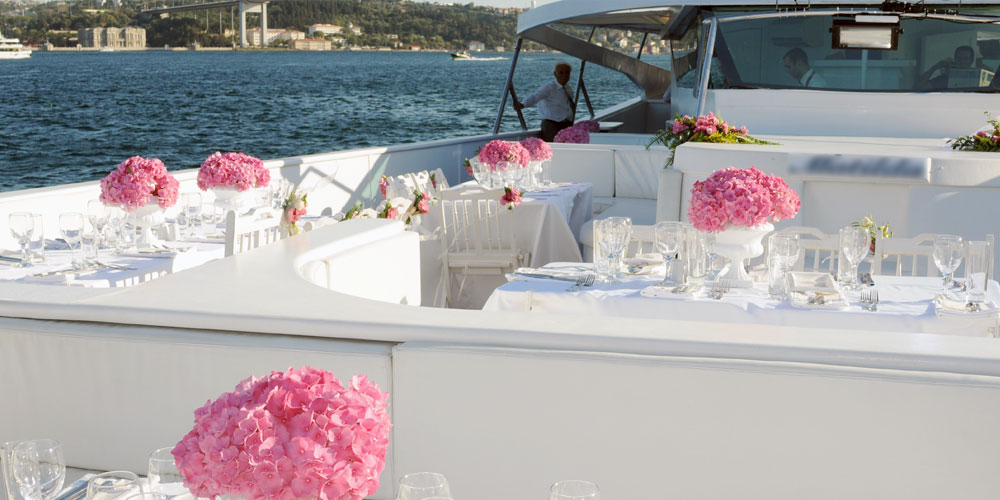 Elegant boats that we work with features a custom design and can offer you breathtaking views of the Asian and European side of Istanbul. Depending on weather conditions your wedding or event can be performed on the exterior deck or indoors.